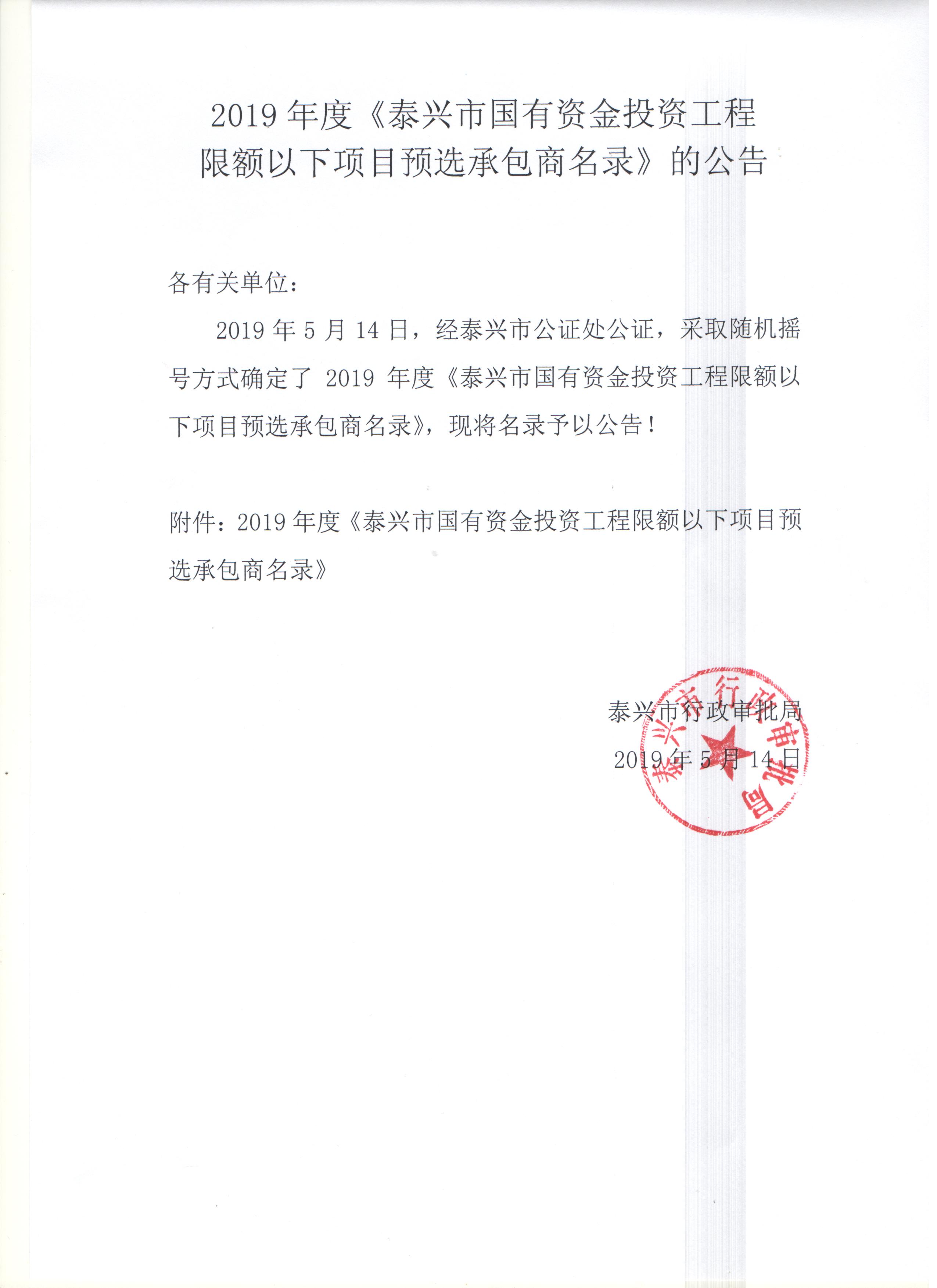 公司入選2019年度《泰興市國有資金投資工程限額以下項目預選承包商名錄》