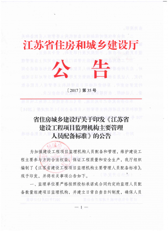 省住房城鄉(xiāng)建設(shè)廳關(guān)于印發(fā)《江蘇省建設(shè)工程項目監(jiān)理機構(gòu)主要管理人員配備標(biāo)準(zhǔn)》的公告(〔2017〕第35號)