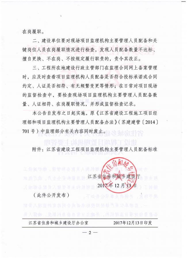 本公告自發(fā)布之日起實施,原《江蘇省建設(shè)工程施工項目經(jīng)理部和項目監(jiān)理機構(gòu)主要管理人員配備辦法》(蘇建建管〔2014〕701號)中監(jiān)理部分有關(guān)內(nèi)容同時廢止。