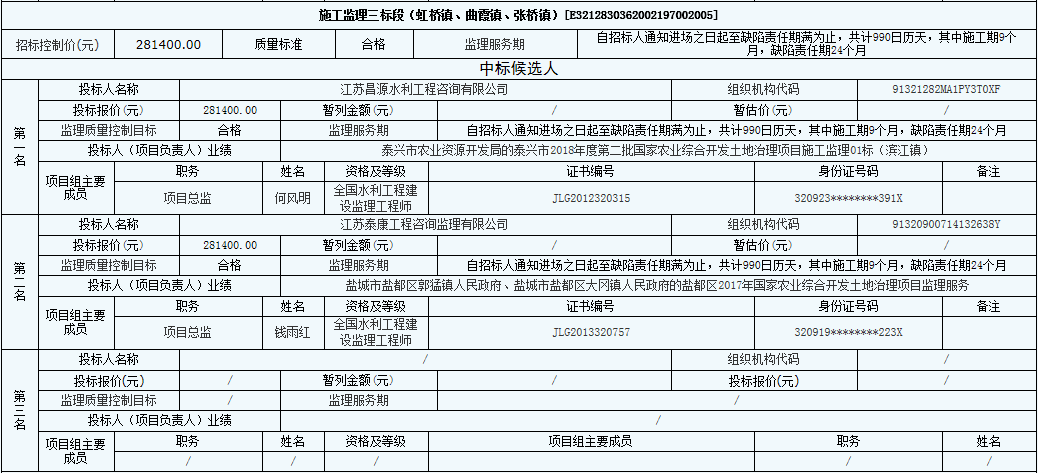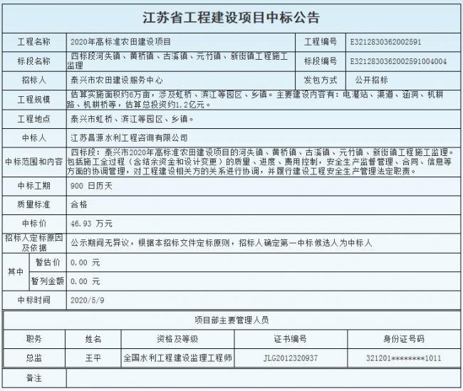 公司中標泰興市2019年高標準農田建設項目的施工監(jiān)理三標段(虹橋鎮(zhèn)、曲霞鎮(zhèn)、張橋鎮(zhèn))